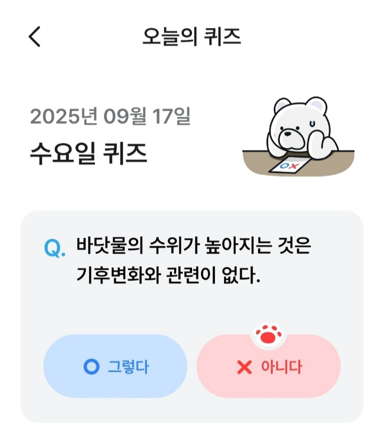 | 기후행동 기회소득 기후 퀴즈 정답 9월 14일 바닷물의 온도 (1) | 2025.09.14 |
